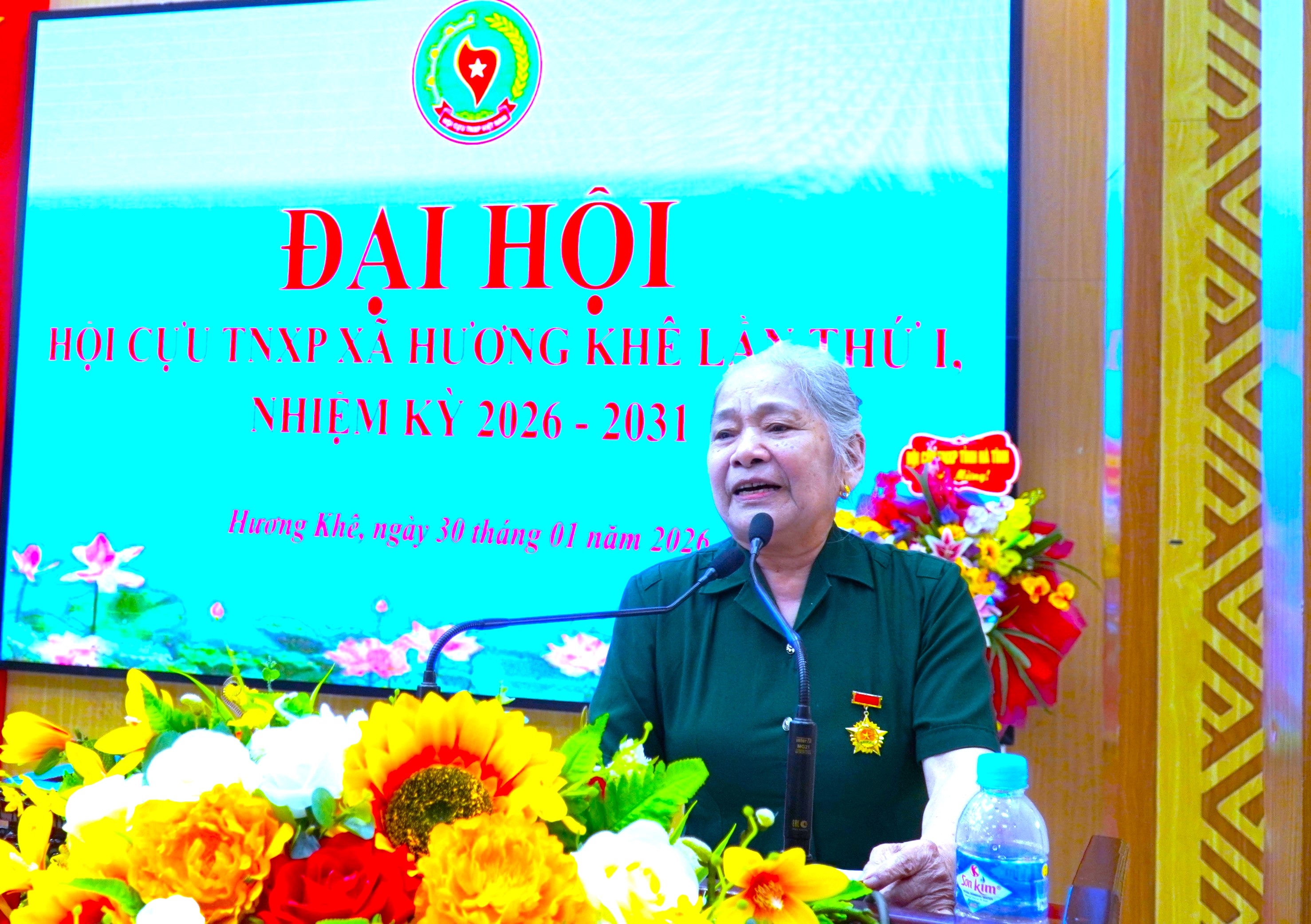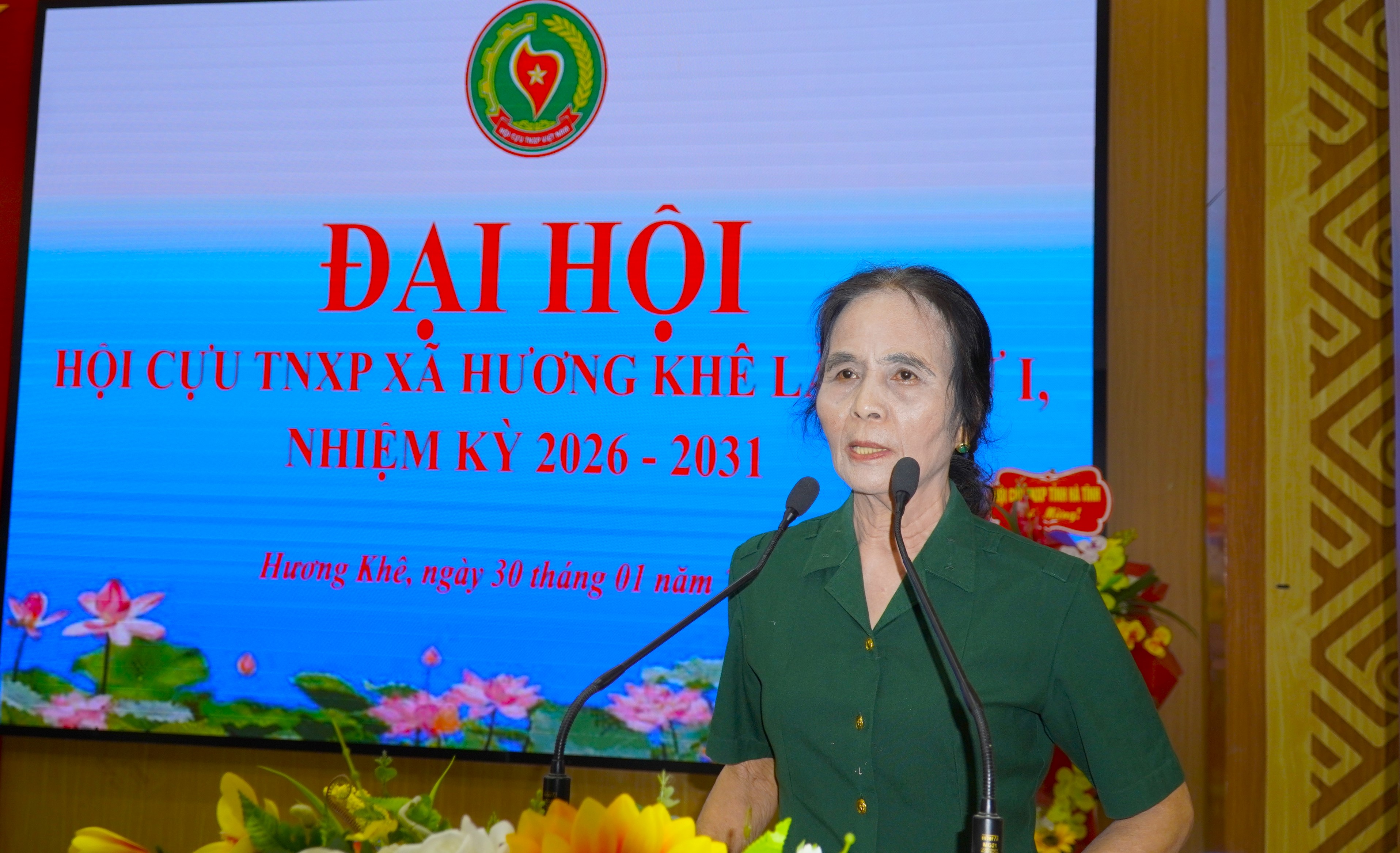 Đồng chí Nguyễn Thị Hoa, Phó Chủ tịch Hội Cựu TNXP xã báo cáo kết quả hoạt động Hội Cựu TNXP xã Hương Khê nhiệm kỳ 2021 - 2026...