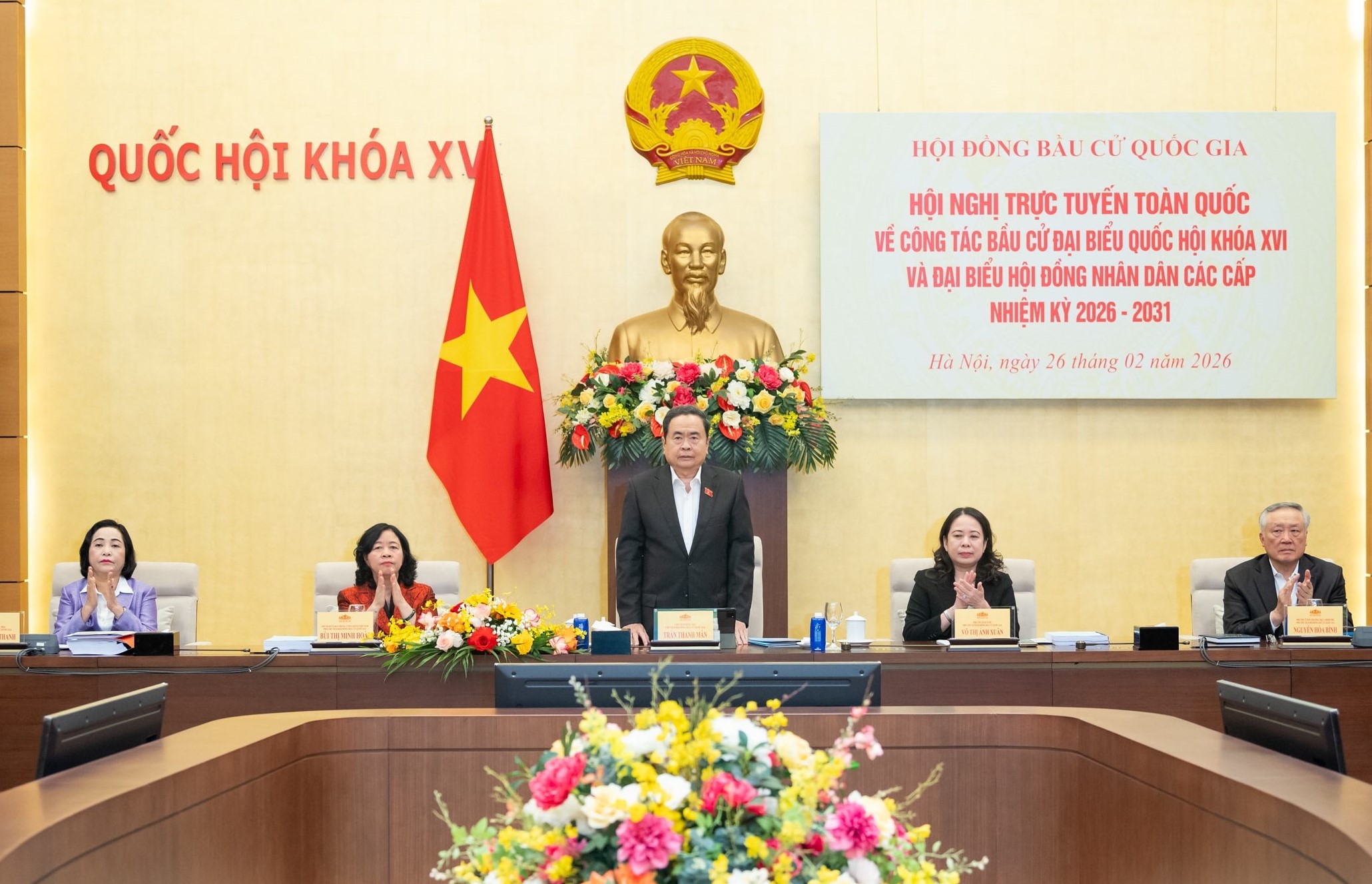 Đồng chí Trần Thanh Mẫn - Chủ tịch Quốc hội, Chủ tịch Ủy ban Bầu cử Quốc gia và các đồng chí đồng chủ trì hội nghị.