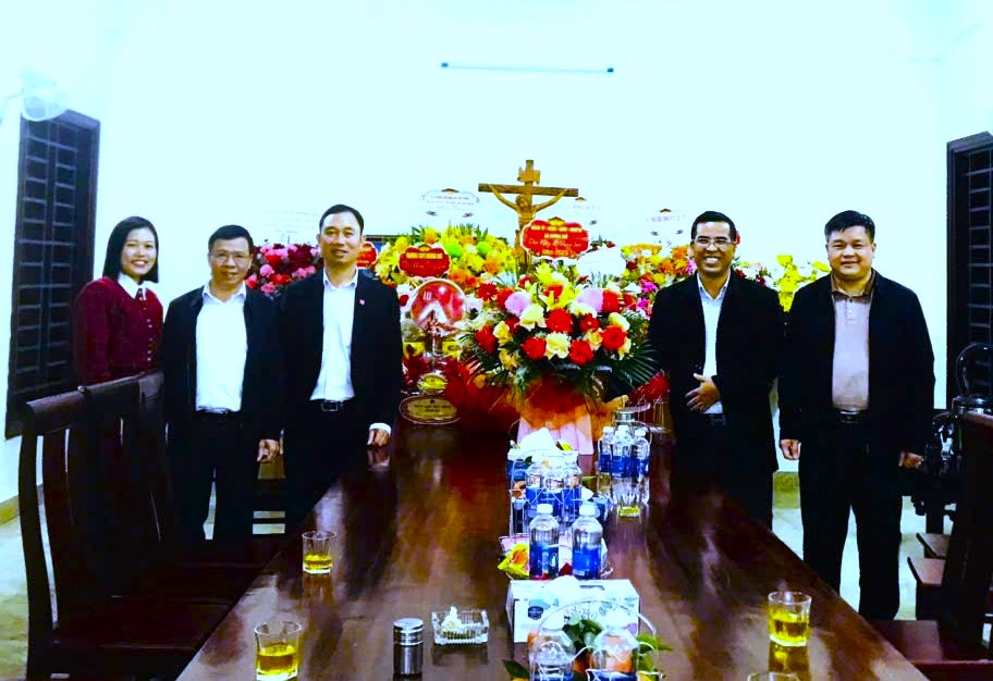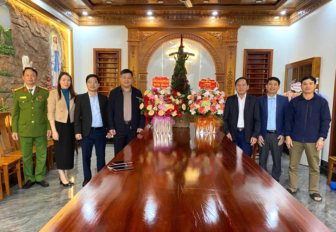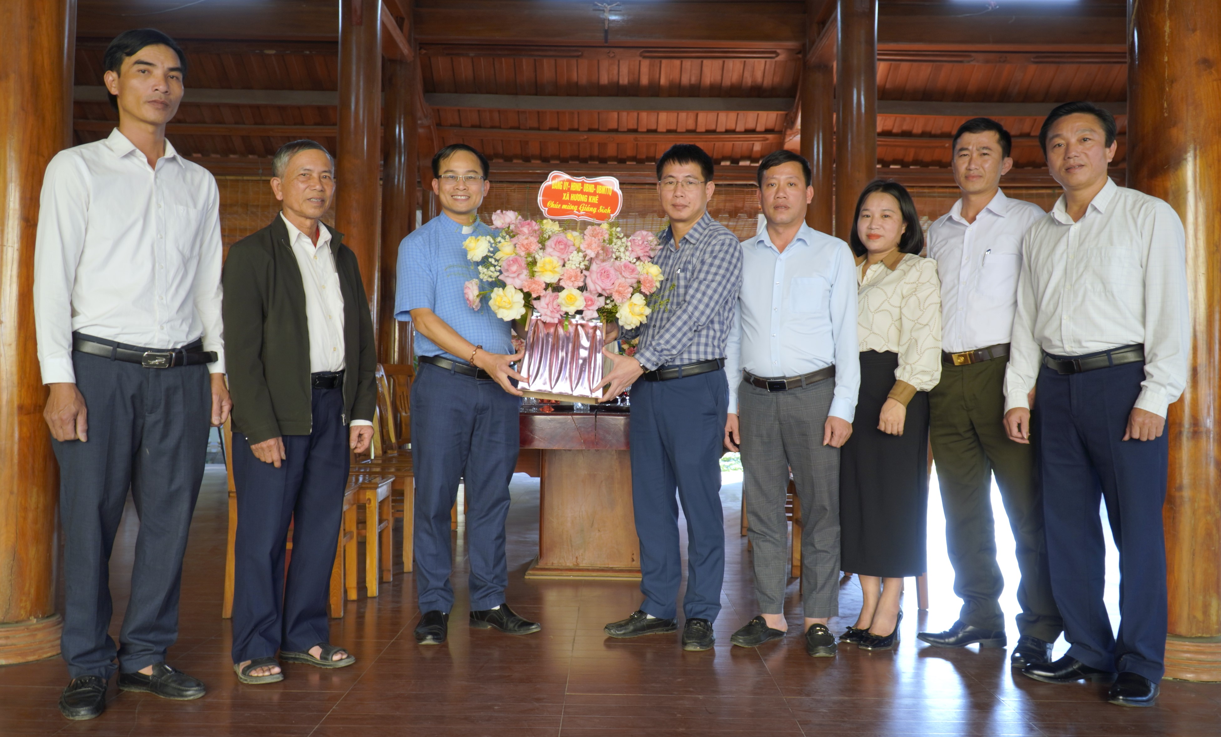 Đồng chí Nguyễn Thế Hùng, Phó Bí thư Thường trực Đảng ủy và các đồng chí trong đoàn chúc mừng giáo xứ Thượng Bình và giáo họ Bình Thọ.