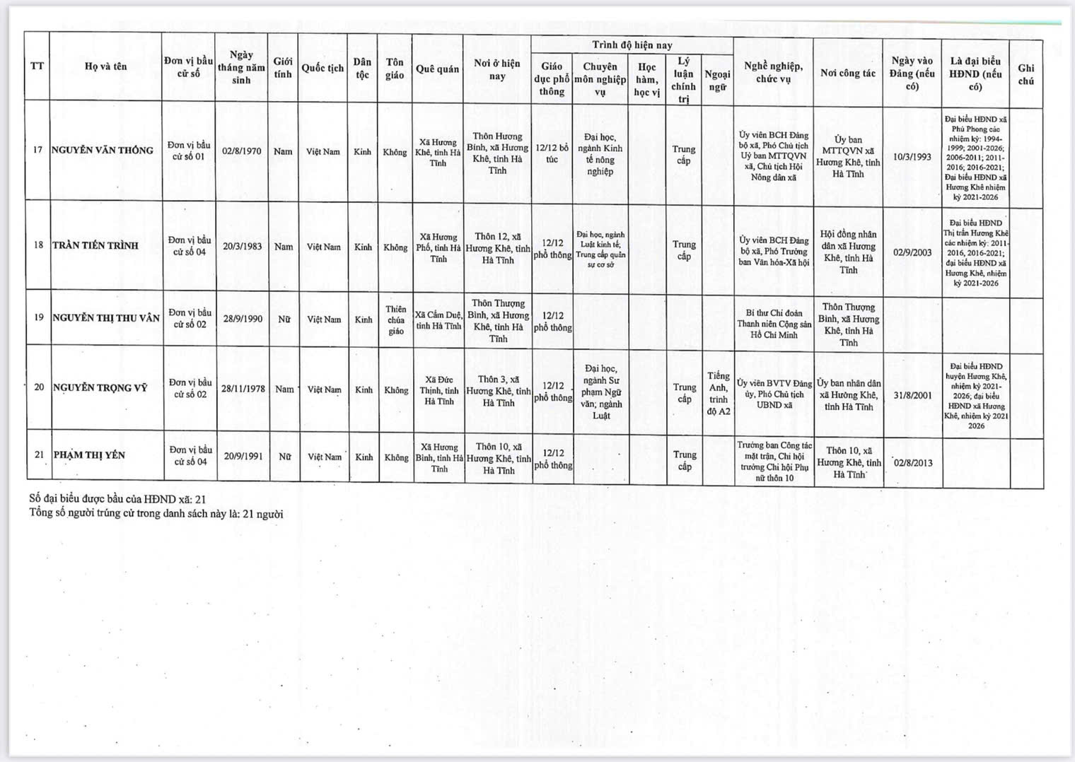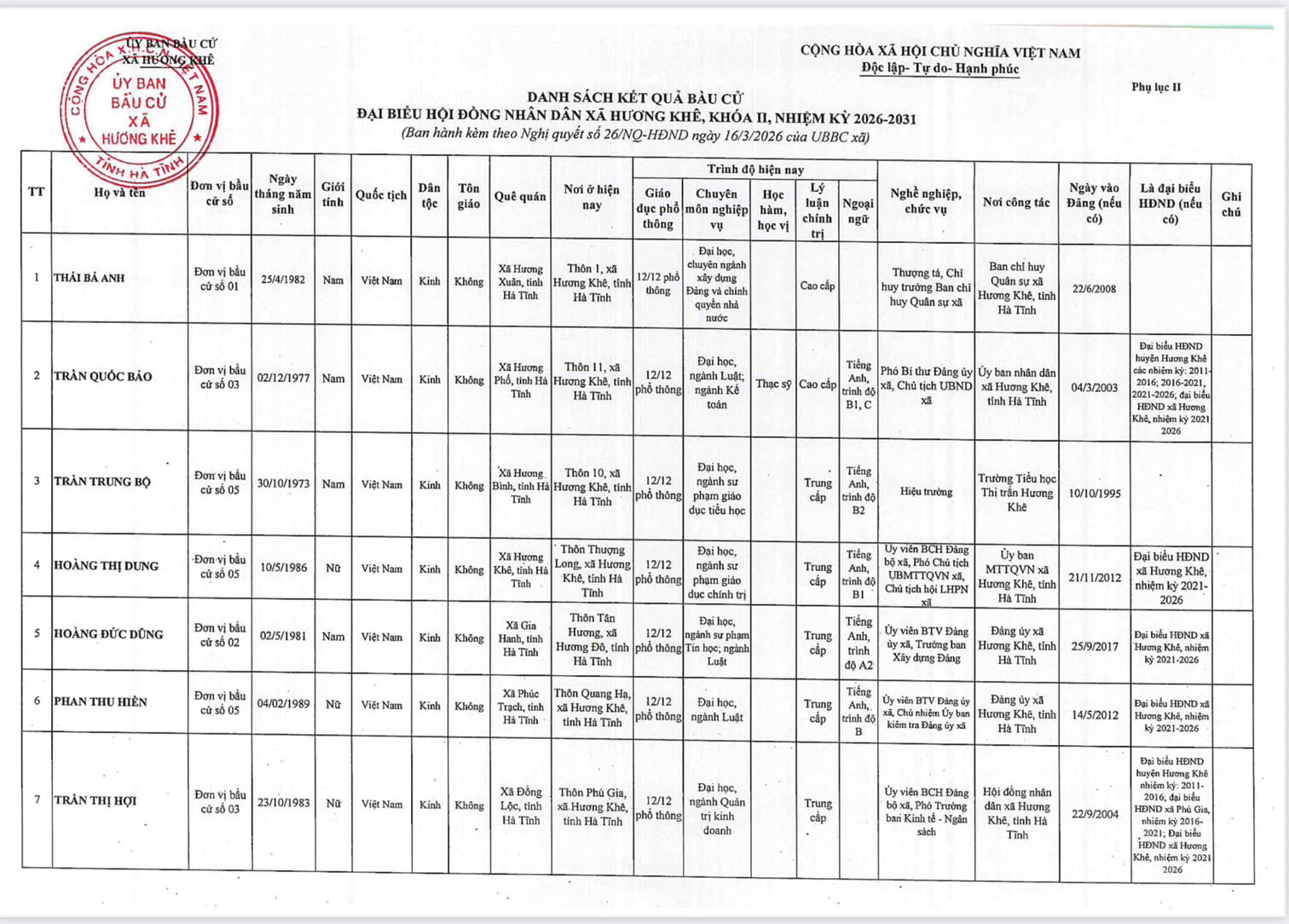 Nghị quyết về việc công bố kết quả và danh sách những người trúng cử đại biểu HĐND xã Hương Khê khóa II, nhiệm kỳ 2026 - 2031Ẩn danh18/03/2026A -A+Ẩn danh18/03/2026A -A+