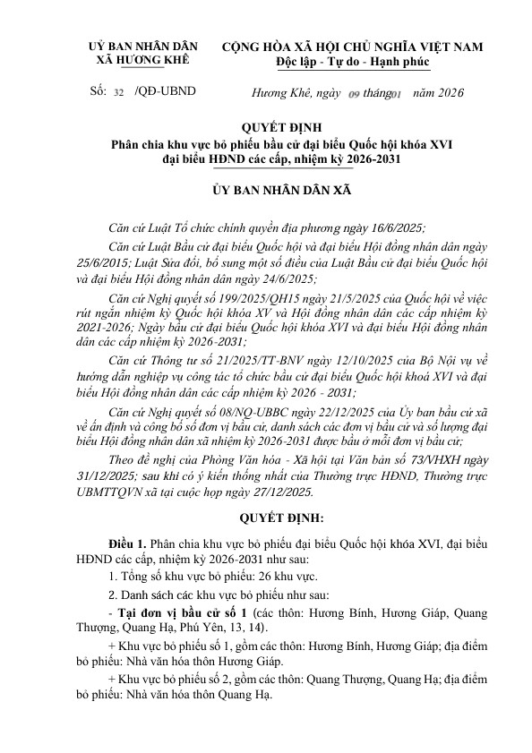 Quyết định phân chia khu vực bỏ phiếu bầu cử đại biểu Quốc hội khóa XVI đại biểu HĐND các cấp, nhiệm kỳ 2026-2031 Ẩn danh02/02/2026A -A+Ẩn danh02/02/2026A -A+