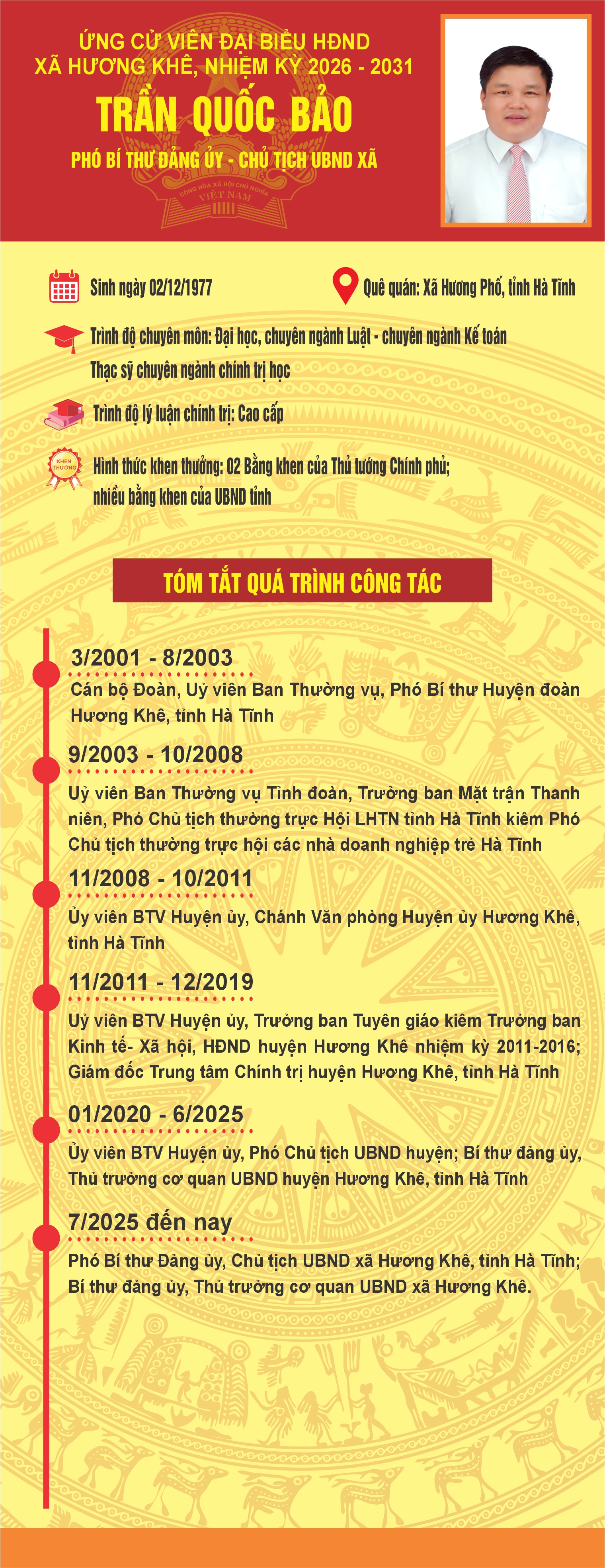 Từ tháng 7/2025 đến nay: Phó Bí thư Đảng ủy, Chủ tịch UBND xã Hương Khê, tỉnh Hà Tĩnh; Bí thư đảng ủy, Thủ trưởng cơ quan UBND xã Hương Khê.