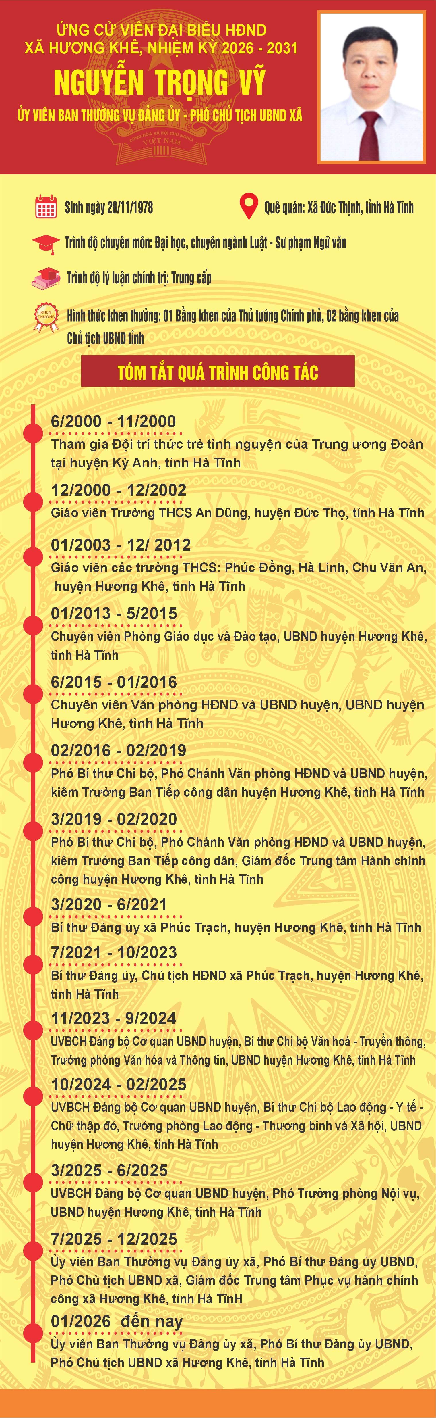 Từ tháng 01/2026 đến nay: Ủy viên Ban Thường vụ Đảng ủy xã, Phó Bí thư Đảng ủy UBND, Phó Chủ tịch UBND xã Hương Khê, tỉnh Hà Tĩnh