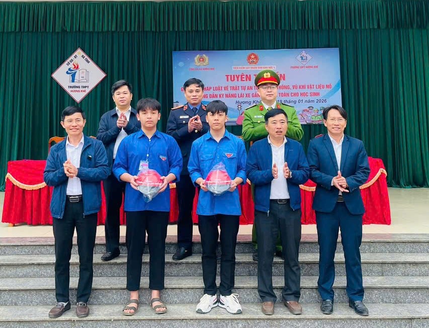 Nhân dịp này, Lãnh đạo VKSND Khu vực 4, Công an xã Hương Khê, Ban Giám hiệu nhà trường và Công ty Honda Phú Tài (Hương Khê) đã trao tặng 19 mũ bảo hiểm cho 01 giáo viên và 18 học sinh đạt giải trong cuộc thi “An toàn giao thông vì nụ cười ngày mai”.