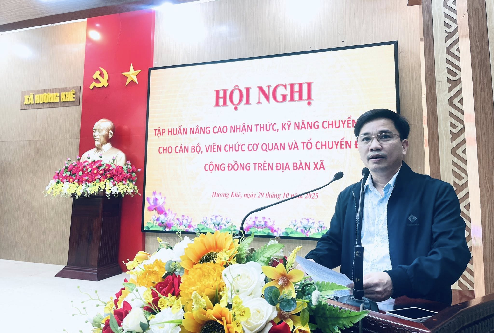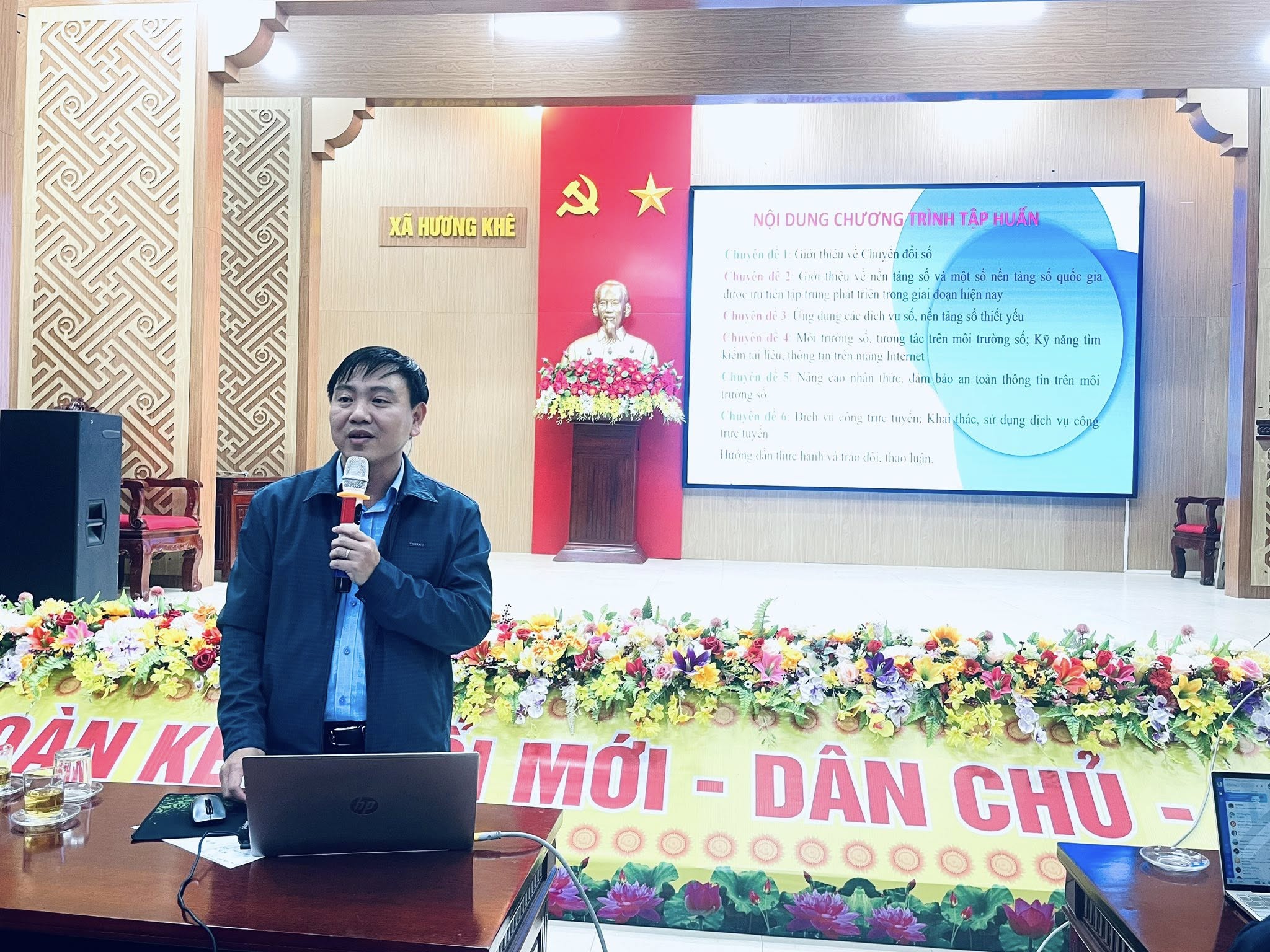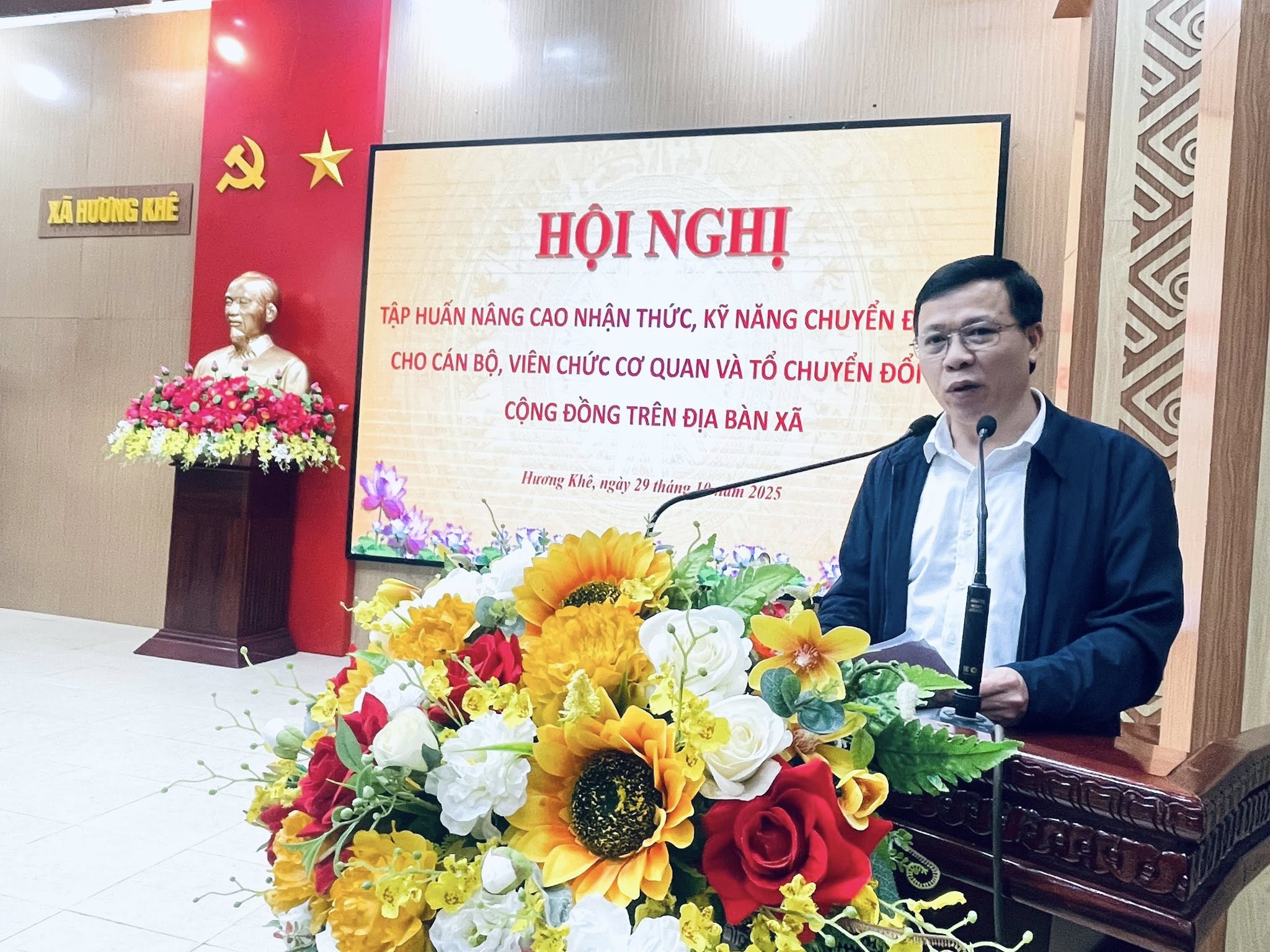 Thực hiện Kế hoạch số 13 ngày 4/08/2025 của UBND xã Hương Khê về triển khai thực hiện Chuyển đổi số 6 tháng cuối năm 2025, chiều ngày 29/10/2025, tại Hội trường UBND xã Hương Khê, UBND xã Hương Khê phối hợp với Trung tâm Khoa học, Công nghệ và Chuyển đổi số Hà Tĩnh tổ chức lớp tập huấn nâng cao nhận thức, kỹ năng chuyển đổi số cho đội ngũ cán bộ, công chức, viên chức và Tổ chuyển đổi số cộng đồng trên địa bàn xã.